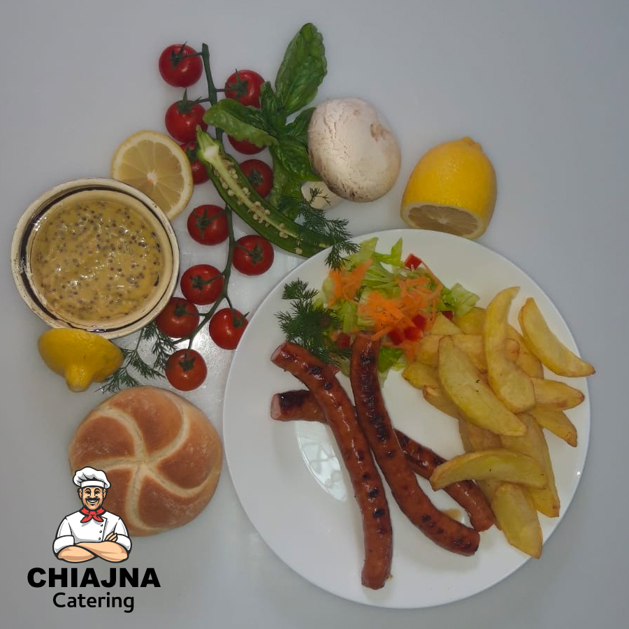 Carnati semiafumati la gratar, cartofi prajiti, mustar