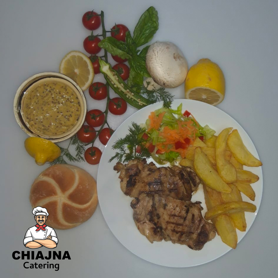 Pulpa de pui dezosata la gratar, cartofi prajiti, salata de varza, sosul casei, chifla