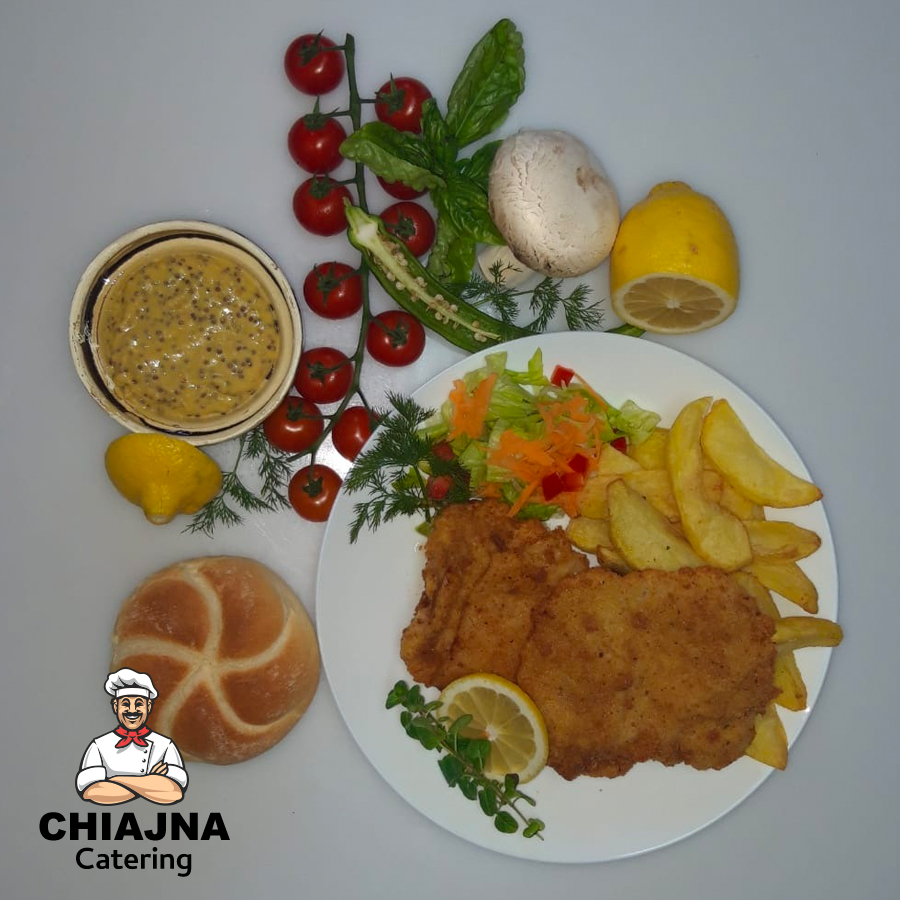 Snitel de pui, cartofi prajiti, salata de varza, sosul casei, chifla