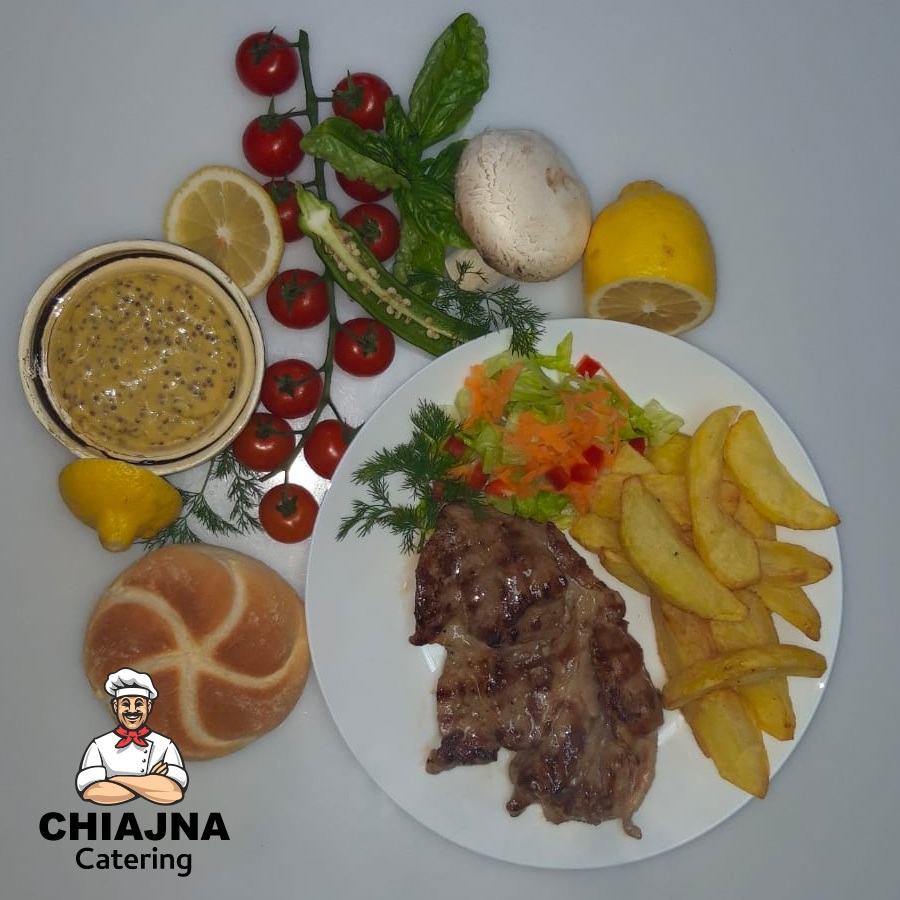 Ceafa de porc la gratar, cartofi prajiti, salata de muraturi, chifla